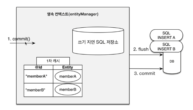 2. 쓰기 지연을 할때: 개발자가 데이터를 저장하면 등록쿼리를 메모리에 모아둔다. 그리고 트랜젝션을 커밋할때 모아둔 등록 쿼리를 데이터베이스에 보낸 후 커밋한다.